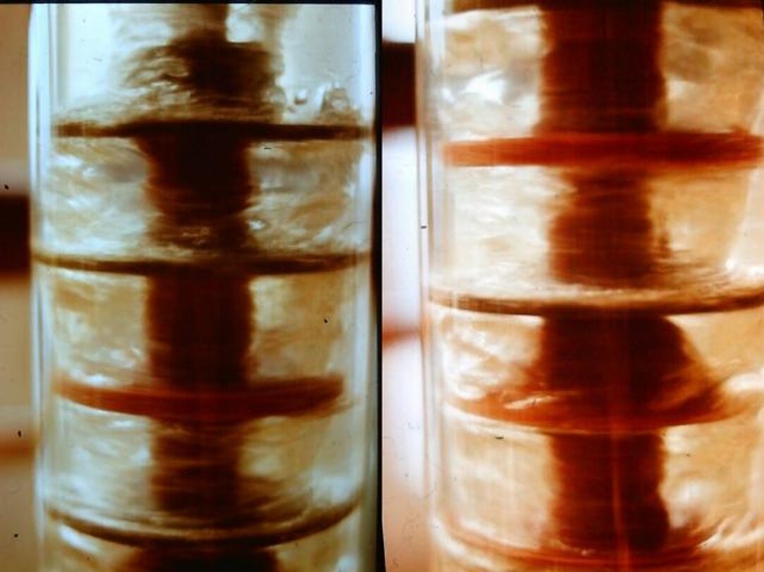 Drehscheibenapparate sind auch für die Begasung von Flüssigkeiten geeignet. Versuche zeigen aber, dass die erwartete feine Dispersion von Gasblasen an den Scheibenrändern unterbleibt ( Bild 1). Bei hinreichender Drehzahl der Welle sammelt sich das Gas in Form von Tromben unterhalb der sich drehenden Rotoren. Bei kontinuierlicher Gaszuführung strömt das Gas am Rande der rotierenden Scheiben in Form von großen Blasen von Trombe zu Trombe. Dabei entsteht eine pulsierende Gasströmung, die für die meisten Anwendungsfälle unerwünscht ist. Auch bei hohen Drehzahlen können die Blasen nicht zerkleinert werden. Messungen zum Stoffübergang ergaben enttäuschende Ergebnisse, da die den Stofftransport limitierende Phasengrenzfläche durch große Blasen relativ gering gehalten wird. Auch für Flüssig-Flüssig-Prozesse (z.B. Extraktion) sind ähnliche nachteilige Effekte zu erwarten, über die aber bisher noch nicht berichtet worden ist. Die Blasenbildung zeigt aber, dass das Mixerprinzip nur unzureichend umgesetzt werden kann.